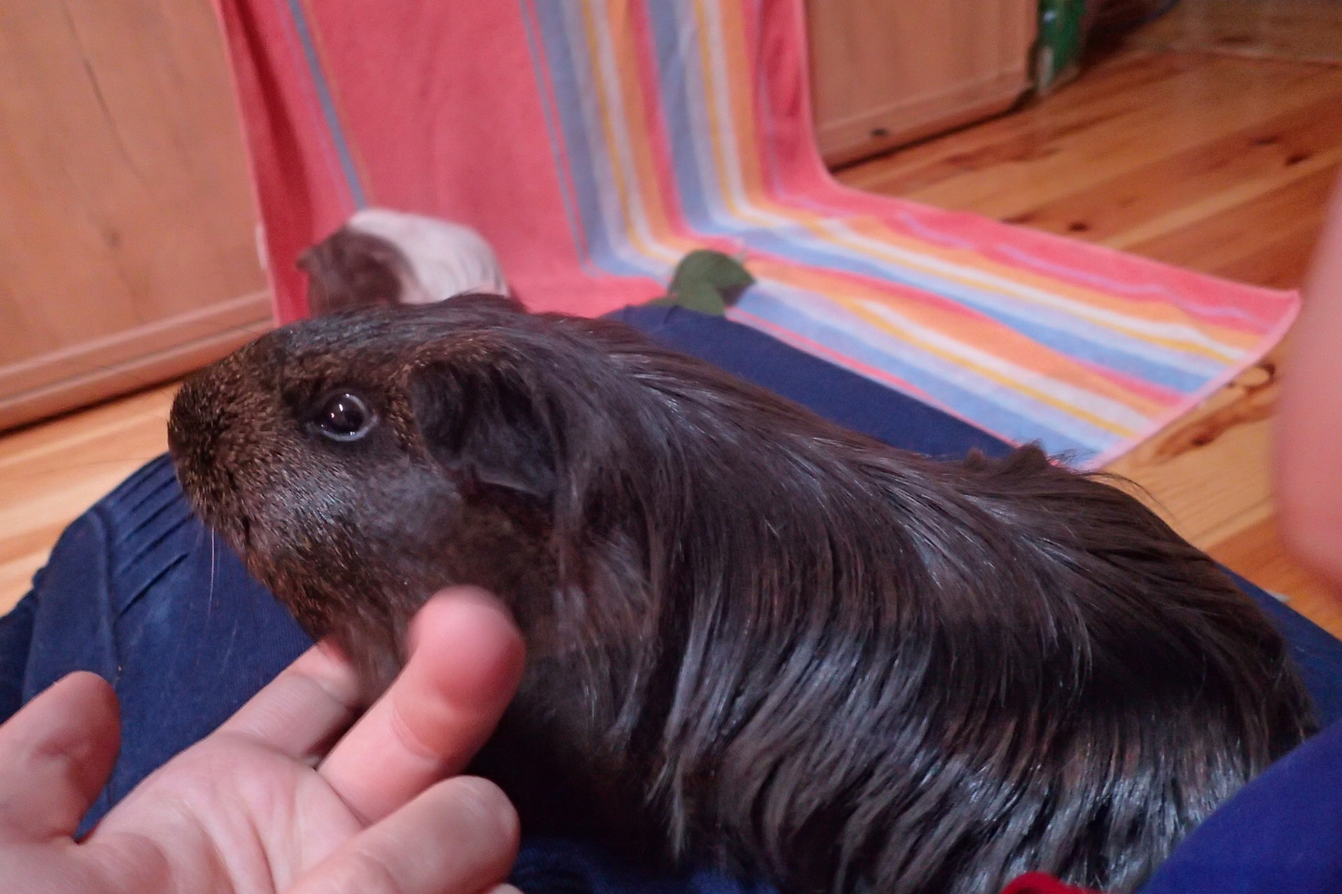 Kapeć najchętniej cały czas by się tulił, rozpłaszcza się na kolanach i nadstawia bródkę do głaskania. Raczej spokojna świnia.