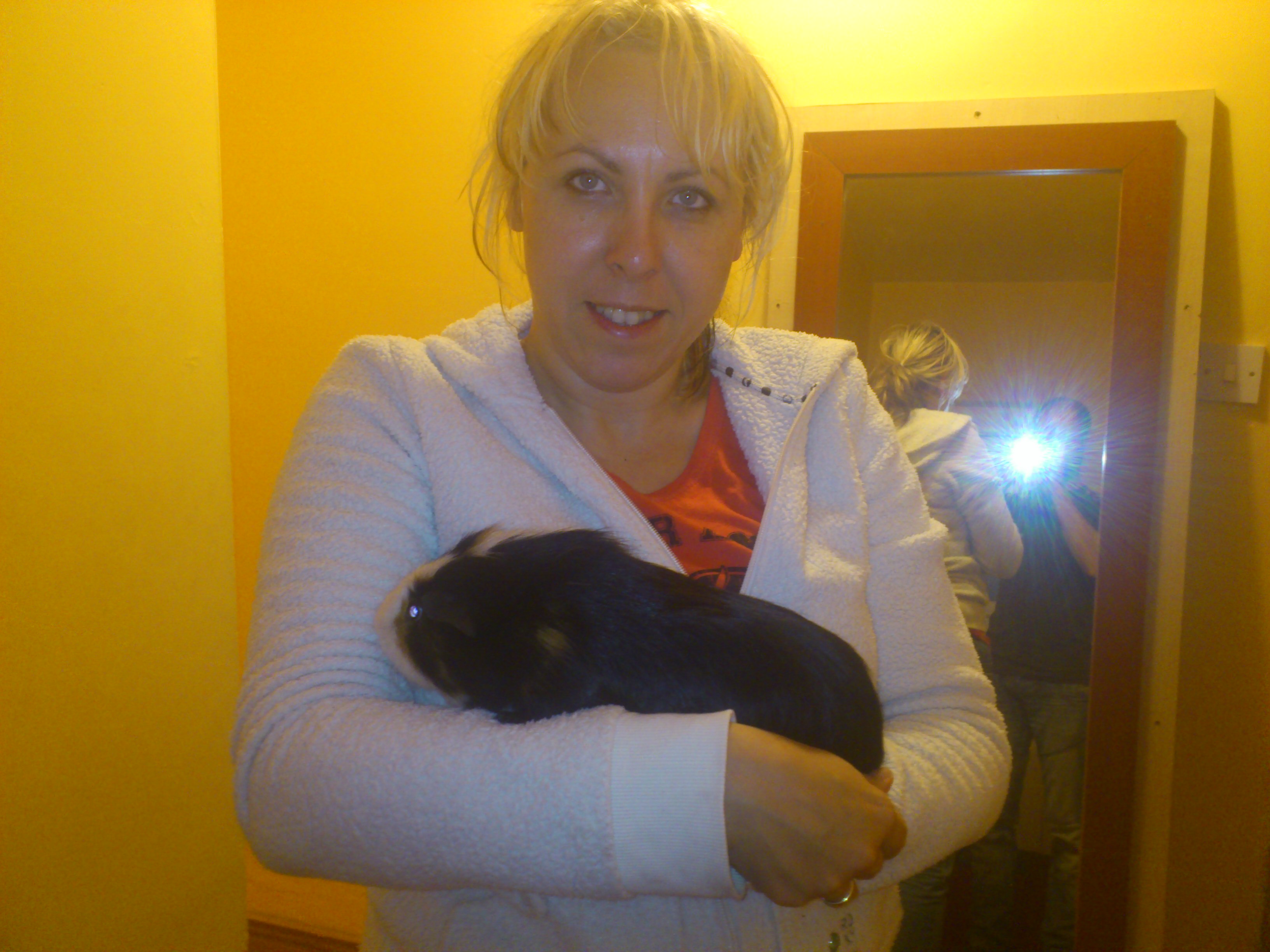 Witam wszystkich. Strasznie dlugo mnie nie bylo ale duzo zmian sie dzialo w moim zyciu. Przede wszyskim praca + zlecenia po godzinach do tego przeprowadzka do nowego domu. W mojej swinko rodzince tez zmiany. Doszedl nam Twister- dlugowlosy bialo grafitowy sheltie, Odszedl za TM Crazie, po dlugiej walce z choroba (buuuu do dzis sie nie moge pogodzic), w jego miejsce przyszla dlugowlosa swinka Olivia de Hannavile (tak z hodowli w Polsce), No i nasz ostatni nabytek Guiness - swinka z adopcji. Guinness jest swinka typu cuy 2-3 letnia, nie jestesmy pewni czy jest Cuyem niedozywionym z dziecinstwa czy to krzyzowka. Na chwile obecna swinka jest bardzo chuda i wazy 1400 g. Opiekunka adopcyjna do ktorej prosk trafil od wlascicieli stawia ze powinien nabrac masy do jakichs 1800-2200g. Ponizej zdjatko moje z prosiunkiem. Obiecuje ze reszte swinek tez powstawiam.