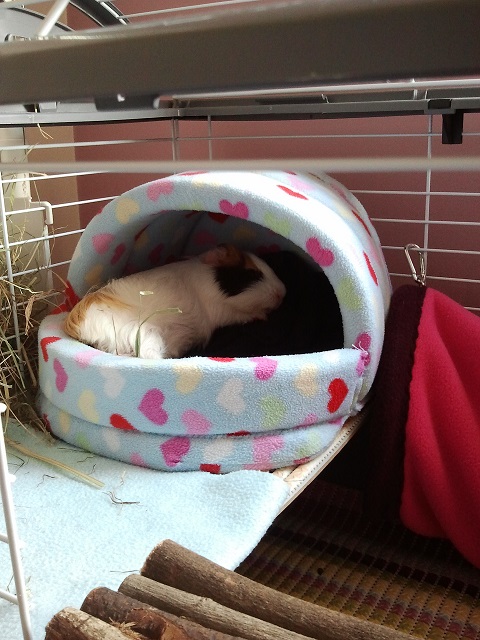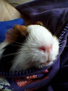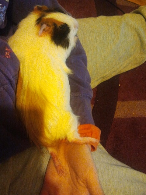 Nutka już nie jest taka malutka ;) Ma już prawie 4 miesiące i waży 596g. Jest bardzo grzeczną i mądrą świnką. Ładnie się oswaja, choć dalej nie lubi brania na ręce. Za to kolanka lub zakamarki szlafroka są najlepsze do wylegiwania się. Kilka nowych zdjęć z Nutką w roli głównej :)