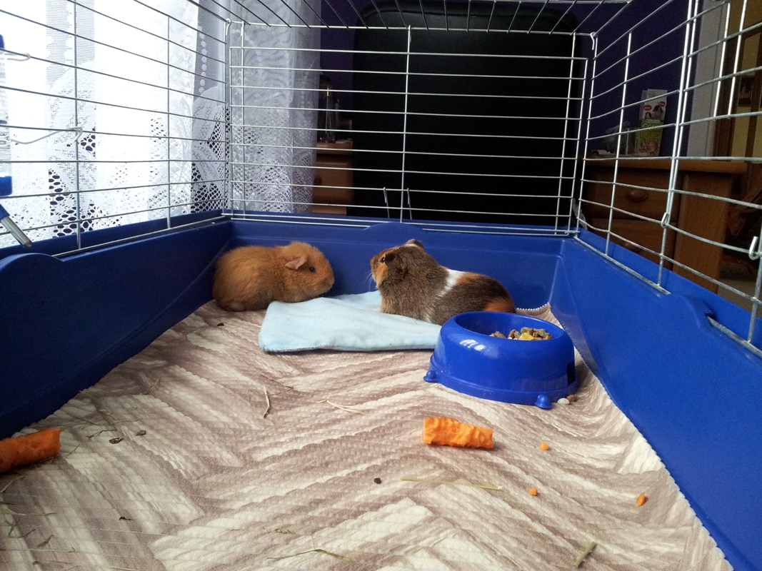 Nugatka - oni są cały czas obok siebie. Z tym ze dzieli ich ściana większej klatki. Podchodzą do siebie co jakiś czas, więc pierwsze lody chyba przełamane. Na początku Kuba gruchał i stawał wysoko na łapach i się kołysał na boki jak mały do niego podchodził ale teraz się to uspokoiło. Dzisiaj pojadę po matę łazienkową i wymyję dobrze klatkę żeby usunąć zapach Kuby. Poprzednim razem na neutralne podłoże wybrałam duże łóżko, ale trochę się bałam że jak zaczną się ganiać to któryś może spaść. No nic - zobaczymy jak to wyjdzie dzisiaj w klatce. Mam nadzieję że Kuba w końcu się zmęczy i da mu spokój.
