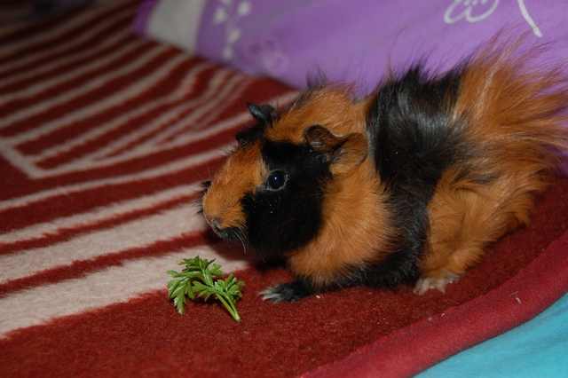 Bella mieszka ze mną dopiero od czterech dni. Jest jeszcze mało ufna, ale powoli pracujemy nad tym. Często chowa się w swoim domku. Uwielbia świeże warzywa i owoce, jest fanką chrupania świeżego sianka