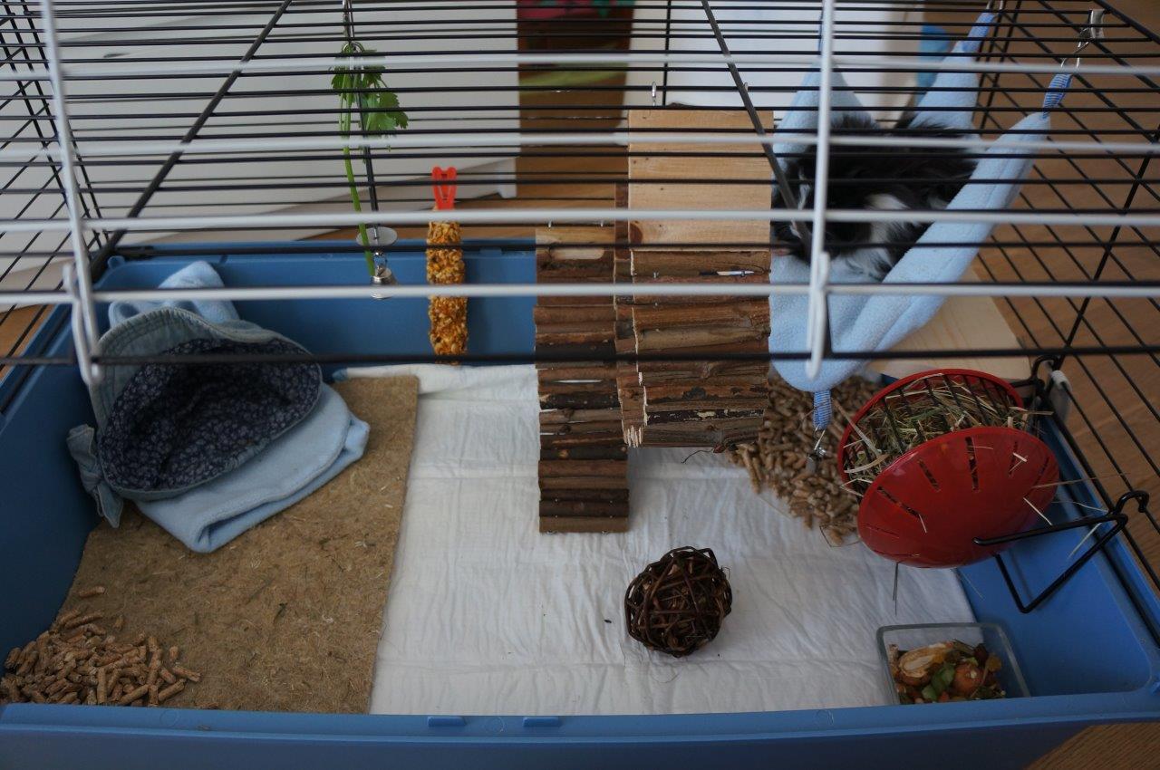 Wklejam jeszcze dwa zdjęcia klatki. Hamak i kocyk sama szyłam, czapka po pierworodnej służy za norkę :D