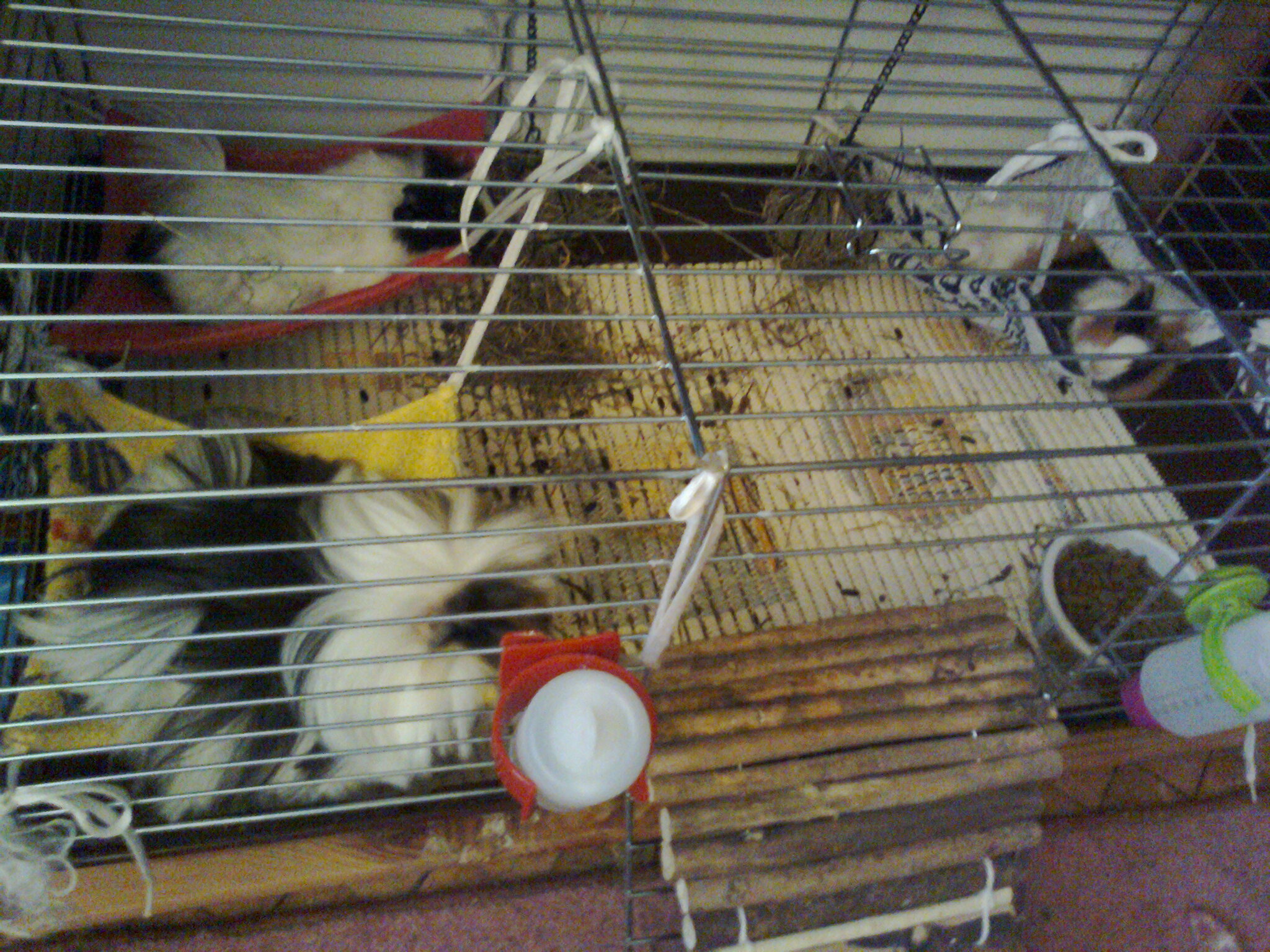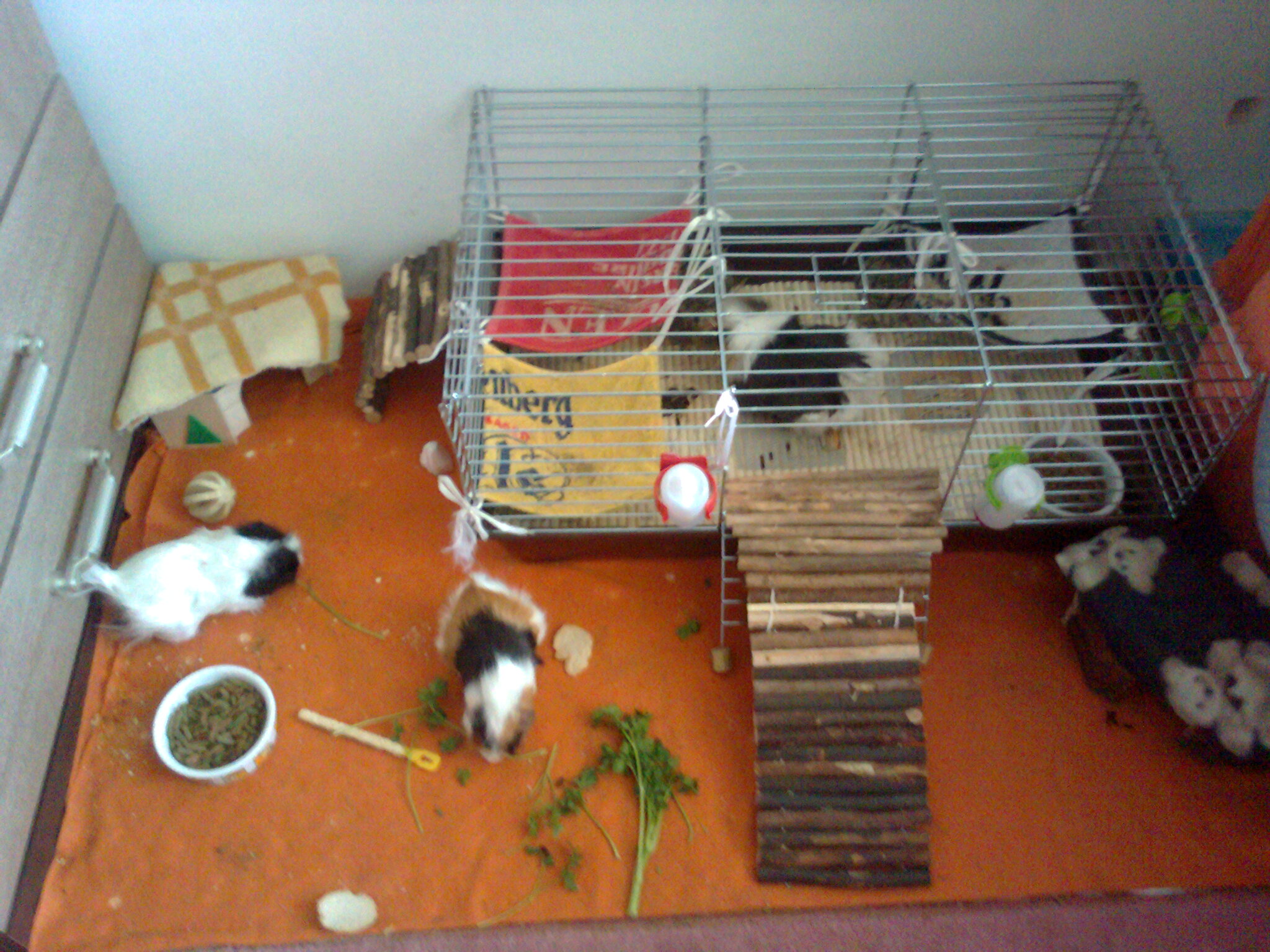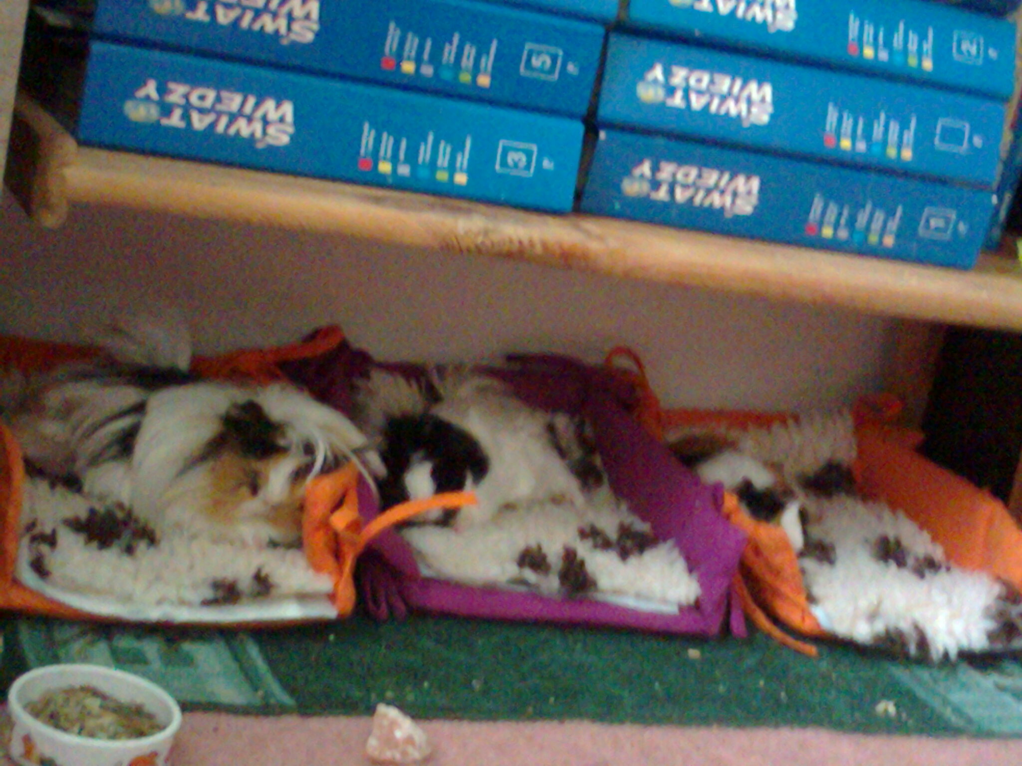 Po dłuższej nieobecności w swoim temacie pochwalę się zdjęciami moich pociech. Od ostatniego wpisu stadko powiększyło się o brata-bliźniaka Tiny, noszącego imię Tofik - bo jest taki słodki i ma podobny do toffi kolorek na grzbieciku i pyszczku. Toficzek oczywiście został wykastrowany, aby uniknąć niepotrzebnego rozrodu. Zabieg przeszedł bez najmniejszych komplikacji i teraz jest już na dobre z dziewuchami :) Świnki mają jedną klatkę 80 + zamykany na noc wybieg - to widoczny na zdjęciach kocyk i jeszcze około 30 cm dywanu łącznie. Takie rozwiązanie lepiej się sprawdziło, niż duża klatka 120 zagracająca pokój. Zresztą i tak od 8 do 21 świniaki hasają po mieszkaniu.