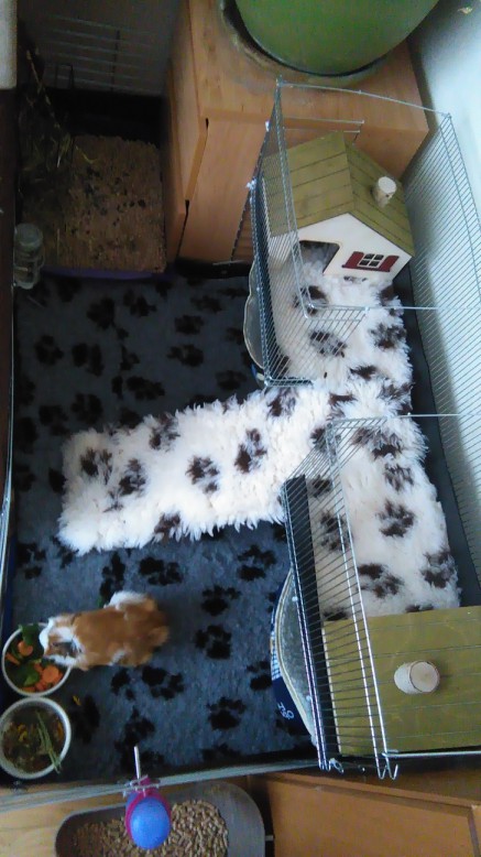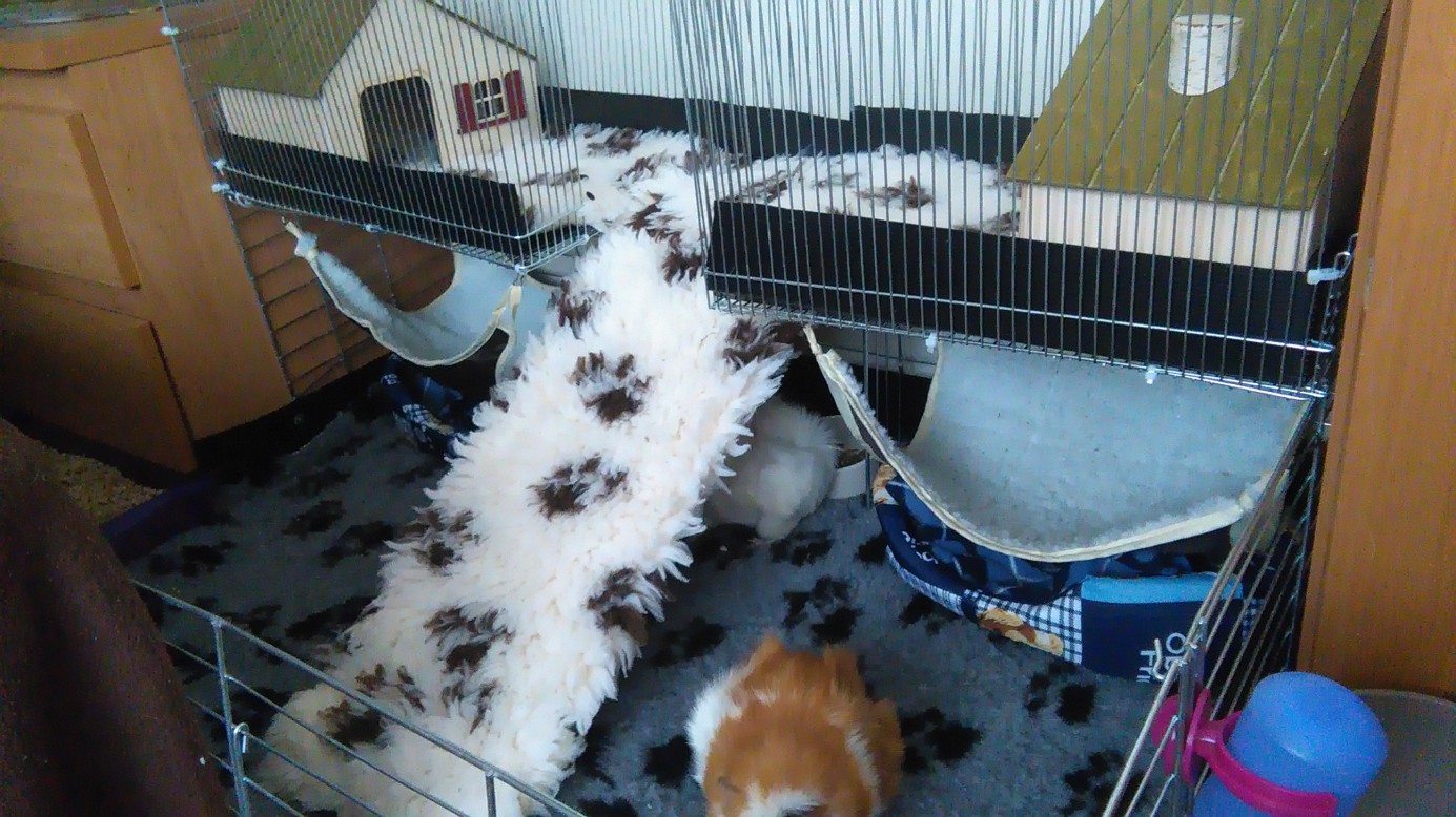 Udało mi się dzisiaj dodać zdjęcie moich świneczek (w końcu ), poniżej dołączam jeszcze parę fotek klatki według mojego projektu, własnoręcznie zmontowanej przy pomocy męża :tooth: i na końcu zdjęcie wybiegu, praktycznie non stop otwartego.