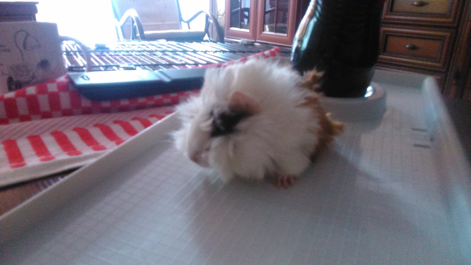 Ja jestem w ogóle pod wrażeniem, jak Mała sobie radzi. Niby bidulka z niej taka, ale po odczesaniu, umyciu, odmoczeniu i odsłonięciu oczek, okazuje sie, ze Malutka umie doskonale pić z poidełka, je karmę, nie pogardzi ogórkiem, uwielbia trawkę i koniczynkę i mleczyki.