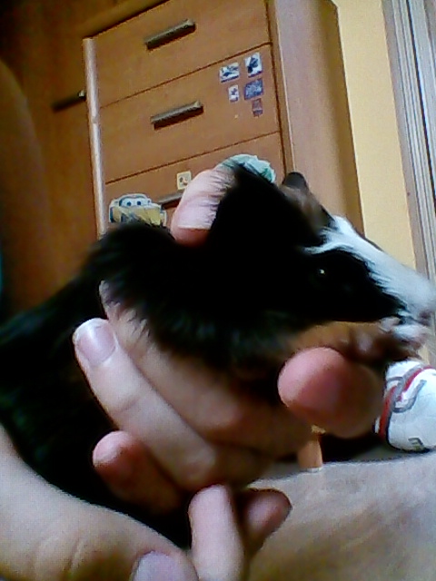 Niedawno dla mojej rocznej Puśki dokupiliśmy małą Czarnulę :) . Jest na prawdę malutka i drobna. Liże mi palce, lekko szoruje po nich ząbkami. Nie chce pić z poidła, zamaczam w wodzie palec i ona to zlizuje. Innej drogi nie ma by piła. Karmę, marchewkę i trawę wsuwa. Ale jedno mnie martwi. Czy przypadkiem ona nie jest za młoda na odłączenie od matki ? :( W zoologiku już była bez mamusi z dwoma niespokrewnionymi zwierzakami jej wielkości. Jeden to facet :shock: a druga babka. Normalnie biegały po klatce i przytulały się. Teraz jak ją puściłam do mojej świni to zaczęły zgrzytać zębami i kwękać. Ta mała powąchała Puśkę po tyłku na co ta ją obsikała :confused: . Nwm co zrobić, tego maluszka czymś dokarmiać ? Mleko kozie itp