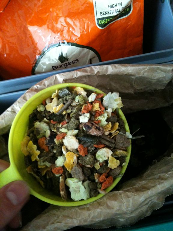 Ja mam wszystkie jej akcesoria (oprócz żwirku, bo on duży, ja zawsze kupuję 10l, a więc stoi w spiżarni) w takim pomarańczowym pudełku, dosyć dużym, z Castoramy. Tam chowam naprawdę wszystko - karmę, zioła, siano, szufelkę i zmiotkę do czyszczenia maty łazienkowej, rękawiczki do sprzątania klatki...po prostu wszystko, oprócz żwirku.