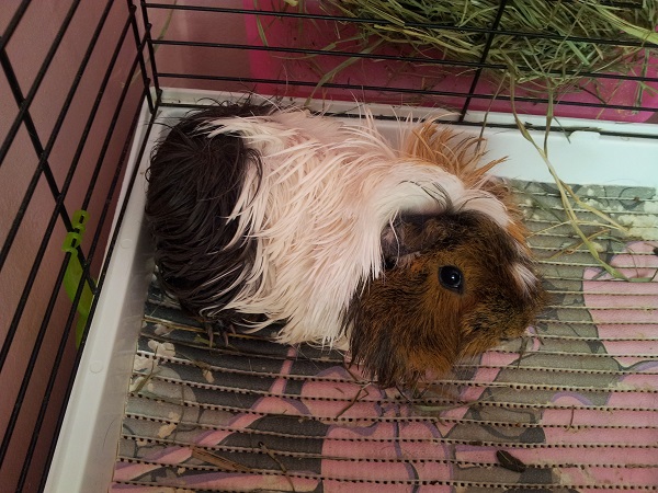 Adoptowałam świnkę w piątek, jest czarna, długowłosa. Poprzednia właścicielka miała pojęcie o świnkach i widać że dbała o nie, ale powiedziała że ostatnio nie miała czasu i zajmowała się nimi jej starsza mama. A co za tym idzie nie była to właściwa pielęgnacja. Świniuś (El Bandito