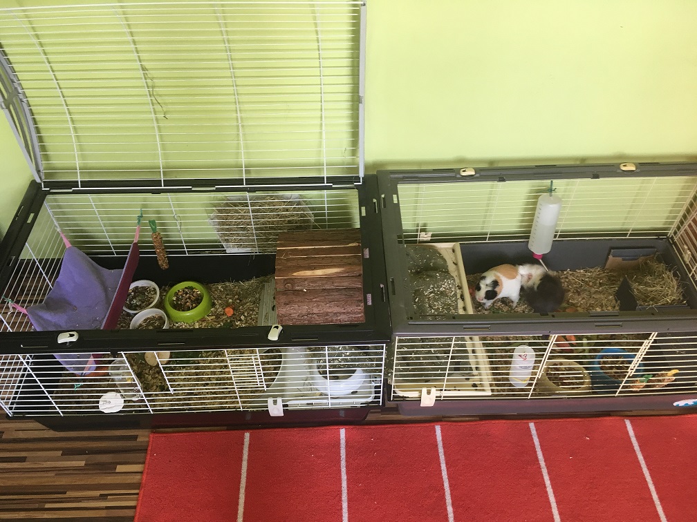 Witam! Łączenie świnek rozpoczęło się w piątek. Niestety nie mam warunków żeby oddać im jeden pokój, więc zrobiłam to w jednej klatce nowej, bez zapachów tych świnek. Zrobiłam im 3 domki z kartonów po butach. Było ostro furgotania, zgrzytanie zębami, stroszenie się... Mikuś mimo, że tamtych dwóch nie dawał się i rozstawiał chłopaków po kątach. Ale jeden z nowych jest wyjątkowo zadziornym prowokatorem ... Po dobie wsadziłam ich wszystkich do nowego lokum. Połączyłam 2 klatki 100 + 100 i na takiej przestrzeni towarzystwo sobie urzęduje. Wczoraj w dzień było już przyzwoicie, ciągle wrzucałam im jakieś smakołyki, dochodziło tylko do małych spięć. Dzisiaj w nocy była grubsza akcja, po której Miki ma rozerwane ucho