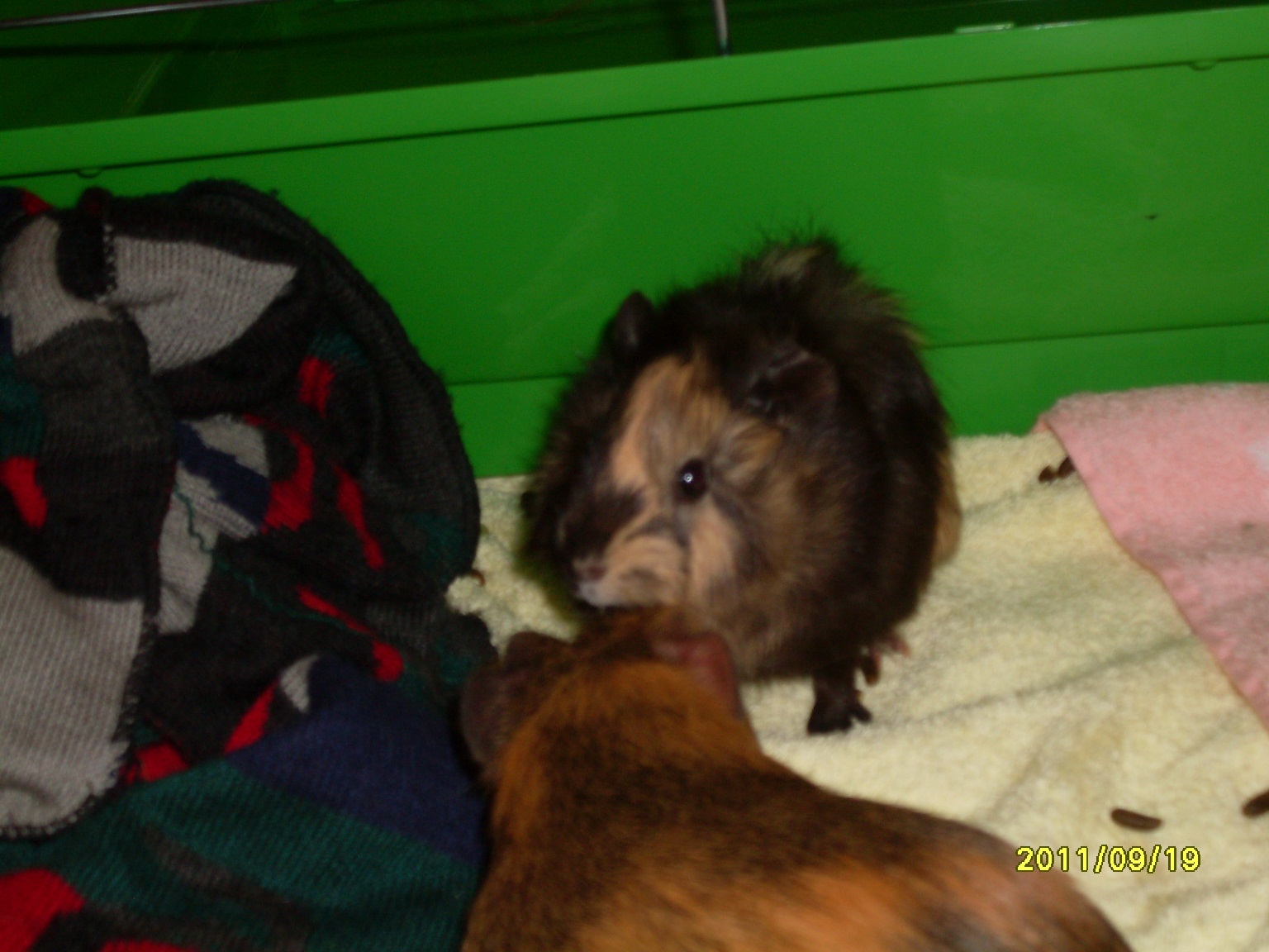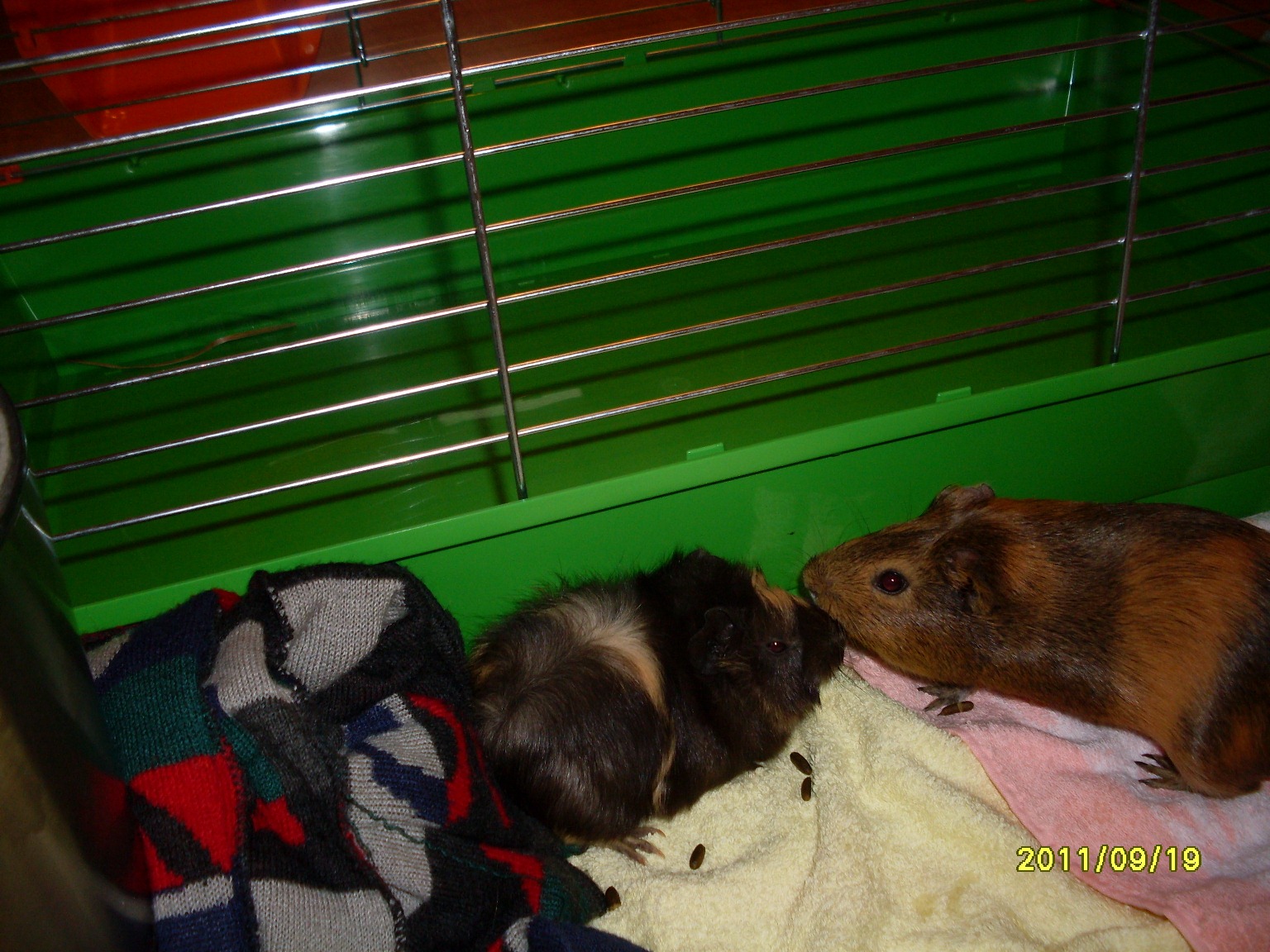 ) w pupę. I było tak dosc długo. Później, kiedy maluszek chciał jesć to Toska odganiała ją od miski albo od poidełka kiedy chciało jej się pić. Teraz w klatce też tak momentami bywa. No i młoda zaczyna glosniej kwikać kiedy tylko Tosia za bardzo się zbliży, tzn kiedy dochodzi do bezposredniego kontaktu. Tosia troszkę ją poskubała, podgryzła lekko ale na szczęscie obylo się bez rozlewu krwi. W klatce też na razie względny spokój, bez większych awantur. Mam nadzieję, że się dogadają