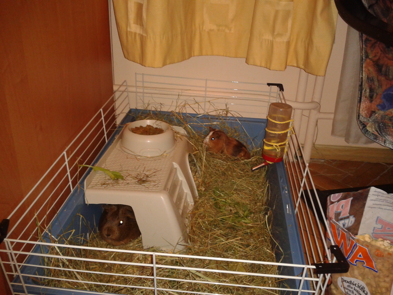 Potem już mieszkały we dwie w klatce o wymiarach 76x46cm z domkiem na jedną czwartą klatki o dwóch wejściach i wydawało się ze jest dobrze. Młoda świnka zaczęła się klimatyzować i okazało się ze jest bardzo ruchliwa i bardzo dużo biega (przy okazji hałasując no ale cóż). Wszystko szło pięknie aż do czasu gdy się zepsuło.