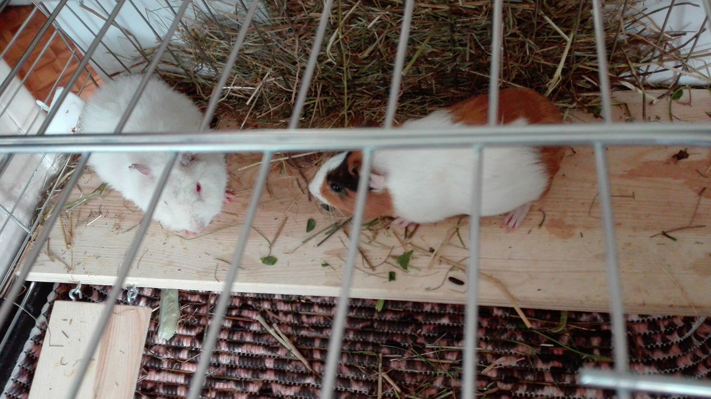 Dzisiaj już razem chłopaki szamali śniadanko z jednej miski, zieleninkę i sianko, potem trochę gonitwy, kilka wściekłych pisków i znów wspólne szamanko.