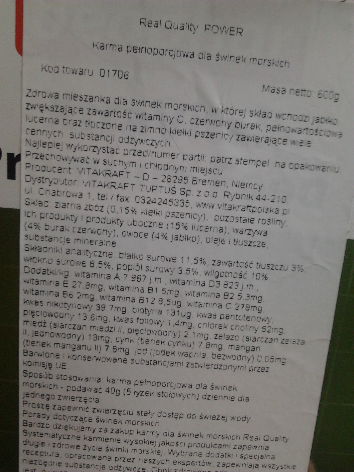 surowka pisze:Ja też chciałam się poradzić, bo znowu kupiłam inną karmę niż zwykle ze względów finansowych. Na VL świnki muszą poczekać do 10Aczkolwiek zmieszałam tą nową karmę z tym co mi zostało z VL i widzę, że świnki chętnie jedzą. Co powiecie na temat składu? Zapomniałam dodać, że jest to karma Real Quality, jednak wyprodukowana przez Vitakraft. Za 600g kosztuje 5,99zł. Pisałam już o niej wcześniej, jednak tamta była Real Quality Balance, a ta jest Real Quality Power i wydaje mi się, że jest lepsza, chociażby dlatego że mam dużo mniej ziaren zbóż.
