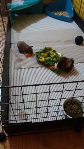 3. Świnki zawsze mają sianko i karmę, mogą jeść bez limitu. Porcję warzyw i zielonych liści dostają 2 razy dziennie: śniadanie przed wyjściem do pracy i obiado-kolację. Taka porcja warzyw to to tyle ile się zmieści na zwykły talerzyk stołowy (np.: garść szpinaku, kawałek marchewki, ćwierć papryki, 1 brukselka, ćwierć małego buraczka, kawałek ogórka, kawałek selera naciowego – na 2 świnki). Czy taki sposób żywienia będzie ok. Nie mam możliwości dawać im pomiędzy tymi posiłkami bo często nie ma nas w domu, więc stwierdziliśmy że nie będziemy ich przyzwyczajać do podjadania. Po prostu talerzyk warzyw co 12 godzin i muszą się przyzwyczaić.