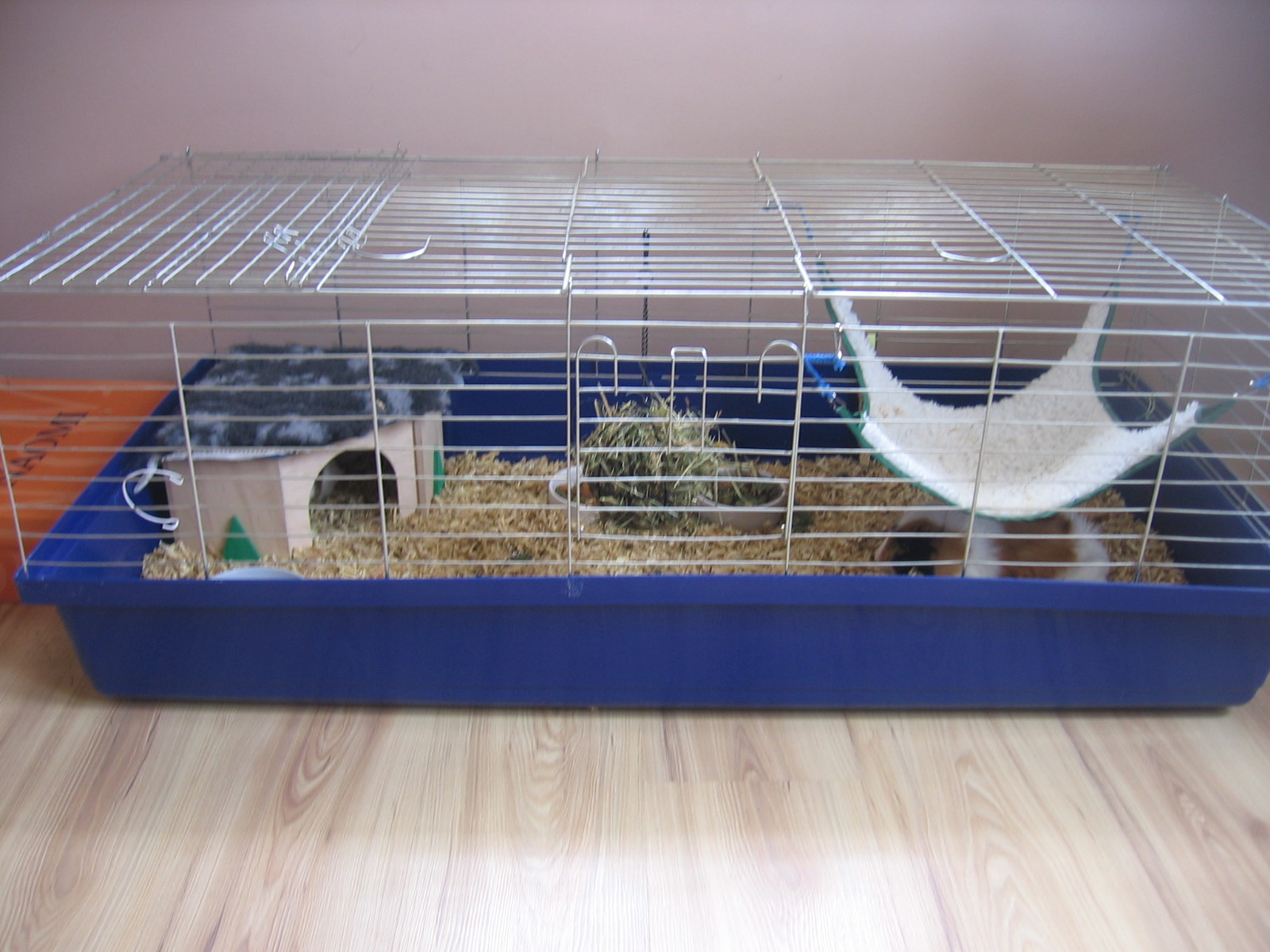 W związku z tym, że kupiłam chłopcom nowy domek musiałam wprowadzić kilka zmian w klatce. Plastikowy duży z FerPlasta nie nadawał się dla nich, ze względu na to, że Drops bez przerwy w nim siedział i nie miał kontaktu z otoczeniem. Domek znalazł jednak swoje zastosowanie na wybiegu, przez prawie 2 miesiące byli więc bez domku w klatce, jedynie pod hamaczkami. Gdy wstawiłam domek stwierdziłam, że hamaków jest za dużo i klatka wygląda na strasznie zapchaną. Teraz wygląda więc tak i myślę, że tak już zostanie.