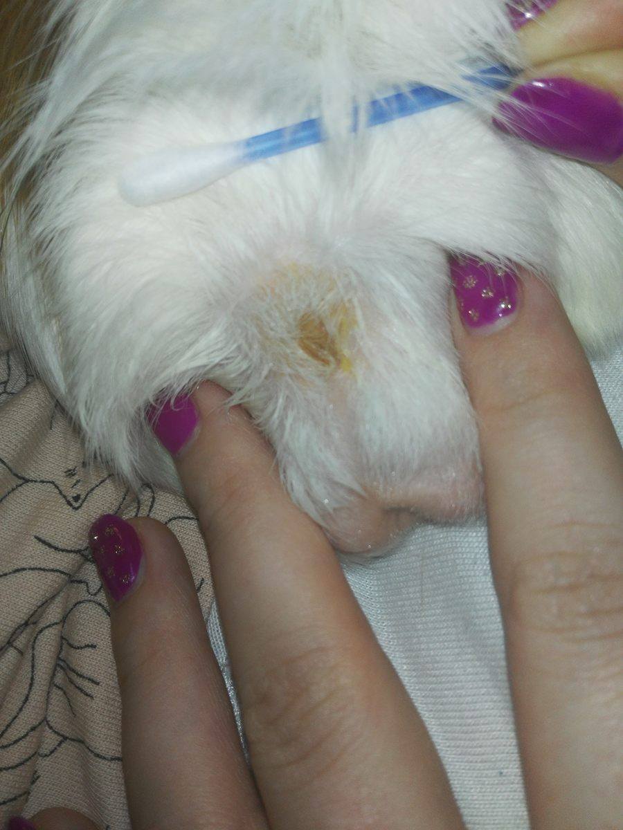 Pierwsze pytanie, czy to jest samiec? bo jesli ta dziwna, klejaca sie plama znajduje sie tuz przed zakonczeniem kupra to bedzie po prostu gruczol lojowy, ktory z wiekiem u samcow staje sie bardziej aktywny i widoczny. Trzeba prosiaka czyscic w tym miejscu czesciej i wyczesywac, by nie utworzyl sie dred zlepiajacy siersc.