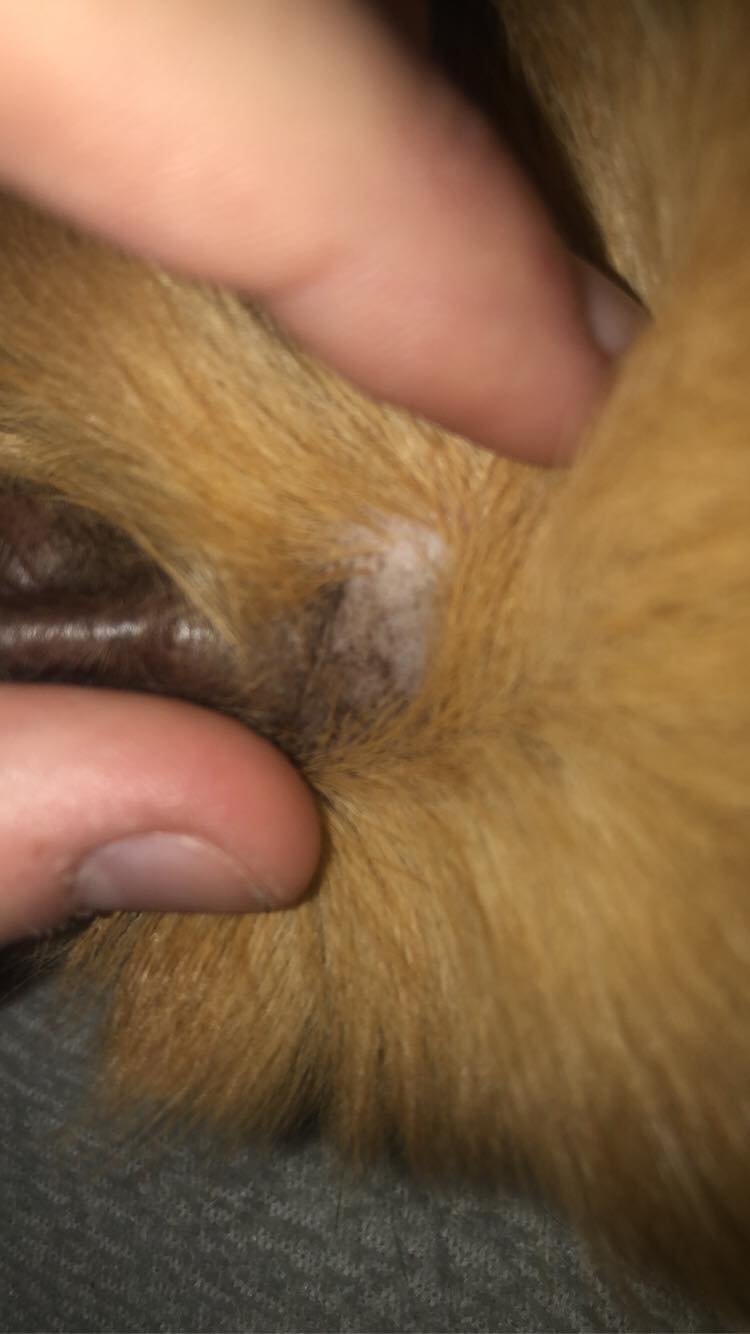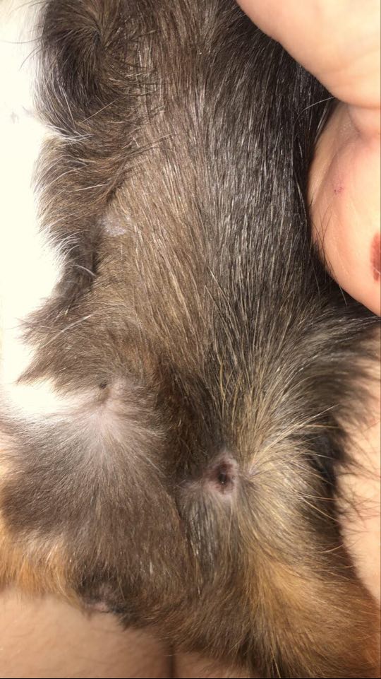 1 ZDJĘCIE --> brzuszek malucha, ma na nim takie krostki, jakby strupki, które teraz zaczęły pozostawiać znamienia? na skórze, dodatkowo jedna jest na przedniej łapce.