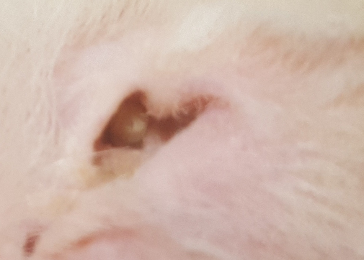 Mój dwuletni samczyk w uchu "czopa". Byłam z nim u weterynarza już dwa razy. Za pierwszym razem dostał zastrzyk i lek do smarowania. Po kilku tygodniach mu zeszło. Jakieś dwa tygodnie temu znowu mu się to pojawiło, byliśmy u weta i ten przypisał nam ten sam lek (nie pamiętam jaki) i powiedział, żeby mu tym smarować. Niestety tym razem mu nie schodzi.