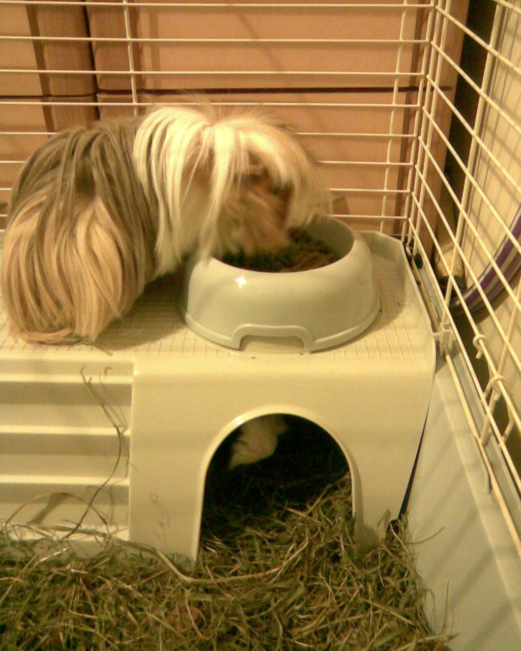 Ja mam 2 małe ceramiczne (jedna na wodę, bo za nic w świecie nie chce pić z poidełka, druga na warzywa i owoce) a drugą plastikową na suchą karmę. Mam identyczny domek jak SsAaYyx3, też był kupiony razem z klatką, ale mój świnuś go obgryzał i zajmował tak dużo miejsca. Kupił takie patyczki, które się wygina i można z tego robić różne rzeczy, zrobiłam domek i świnka może go bez problemu obgryzać
