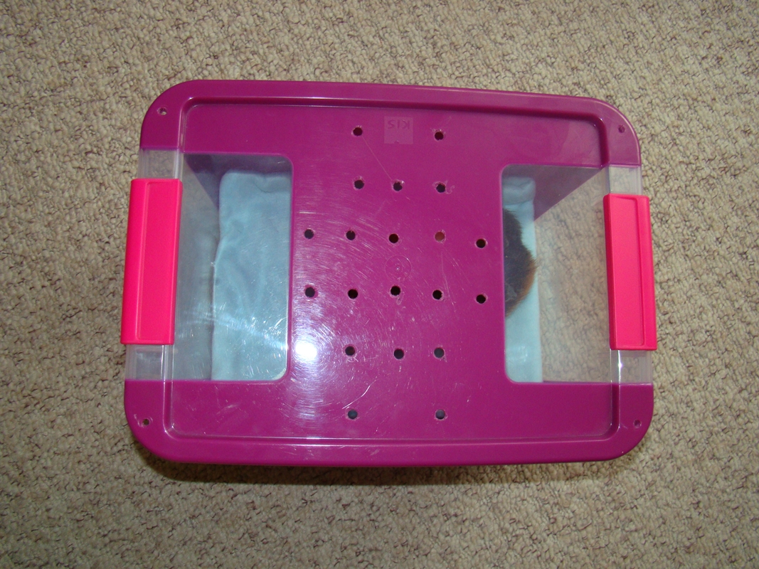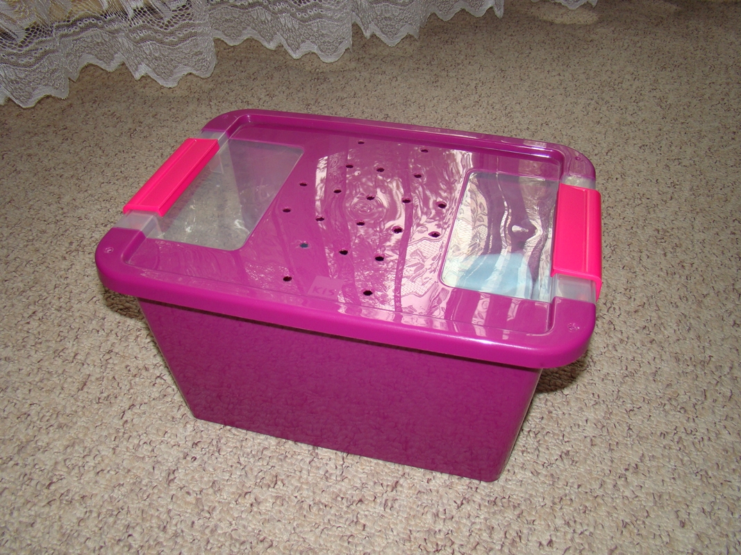 Pojemnik zamykany na zatrzaski kupiłam w Leroy Merlin za ok 25 zł :) (do wyboru było kilka kolorów). Naznaczyłam sobie markerem kropki w pokrywie, po czym wywierciłam otwory :). Taka konstrukcja gwarantuje dobrą wentylację a przy tym w chłodne dni - ogranicza zbyt duży dopływ zimnego powietrza. Kiedy ostatnio byliśmy u weta na obcięciu pazurków i było gorąco - Kubuś po prostu jechał w autobusie bez przykrywki :). Na rogach też są otworki - tam przymocowane były wcześniej rączki ze zwykłego białego skręconego sznurka do wieszania prania. Przy takim rozwiązaniu otwieranie pojemnika było trochę utrudnione - dlatego potem z niego zrezygnowałam.