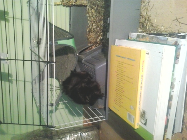 Oj bo Ci zje te książki. :> Moim zdaniem, problemem nie są schodki, bo w zoologach są takie drabinko-mostki, które leniwym świnkom ułatwiają wychodzenie z klatki. Najważniejsze to znaleźć domek, bo ten co macie jest chyba niski. Świnka wskakuje na niego, ma hamaczek, więc do tej wysokości daje radę.