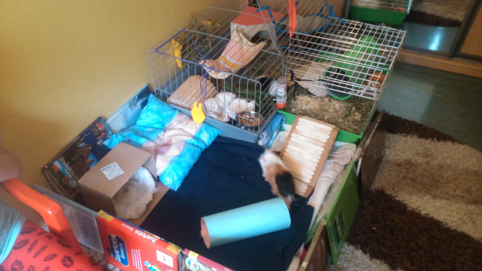 Czekamy na klatkę dla naszych Skarbów Zuzi i Basi (przyjdzie pewnie we wtorek, oraz czekamy na jeszcze jedną świneczkę (w piątek). Oglądam tutaj klatki, patrzę, jak sie je łączy, gdy tymczasem mój 12 letni synek (autysta - Aspergerowiec), zamknął sie w pokoju i od godz. 11, mimo koszmarnego upału i póxniejszej burzy, SAM (w 100% SAM) wykonał taki właśnie wybieg dla swoich Maleństw. Połączył klatki - sznurkami, sznurówkami, czym sie dało, przeniósł tunel z jednej klatki do drugiej, otworzył klatkę tak, aby świneczki miały wybieg. Młodsza siostrzyczka (7 lat) zrobiła drabinkę ze szpatułek lekarskich - pooklejała sztywne opakowania po pudełkach patyczkami . Potem obydwoje poukładali ksiązki wokół wybiegu, wymościli kocykami, dołożyli poduszeczkę, domek... PODARLI DWIE SKARPETY, bo w środku był polarek :), wymościli domek tekturkowy w srodku i powstało takie cudo. Jak dla mnie REEWELACJA :). Obawiam sie tylko, że świnki biegając na wybiegu w nocy poprzewracają ksiażki i gdzies uciekna - mamy meble na podwyższeniach, dziurę pod łóżkiem... boje sie. Tak więc na noc będzie wybieg nieczynny, ale na cąły dzień.... Sami zobaczcie - dzieło dziecka, które jest INNE :) :