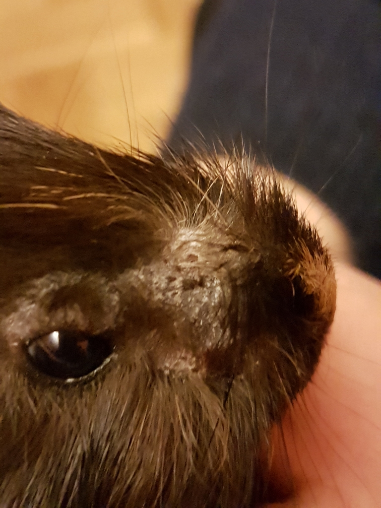 Dziś zobaczyliśmy że z lewej strony pyszczka pojawiły się ubytki futera i jakieś strupki.